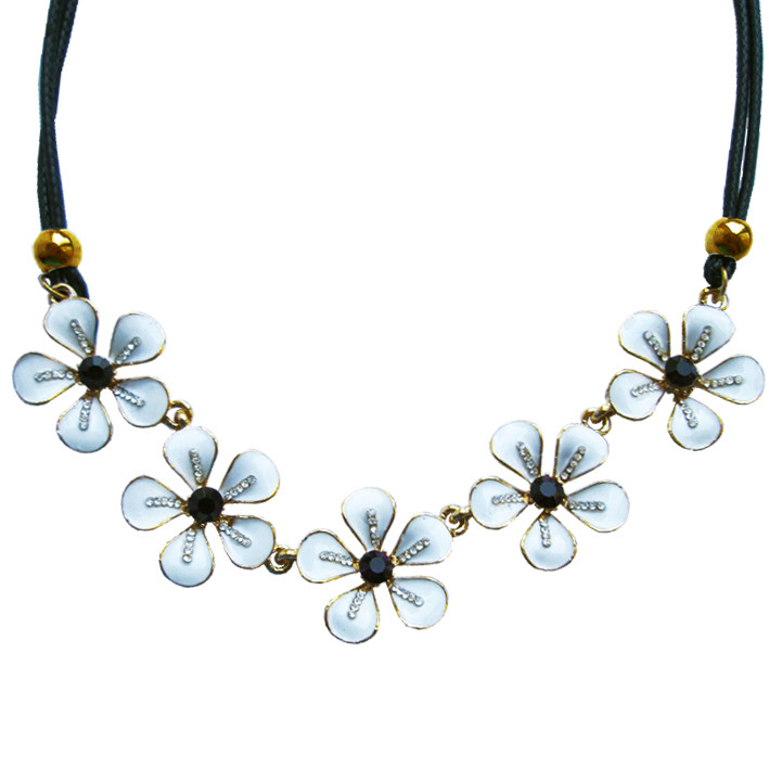 П'ять фактурних квіток сакури виконані з ювелірні сплаву золотистого кольору, зверху вкриті білою емаллю і маленькими білими стразами. Центр квітки вінчає кристал темно-темно-винного кольору. Квіти з'єднані між собою мобільно. Цей віночок з білих квітів з'єднаний з подвійним чорним вощеным шнуром і застібається на застібку типу "карабін".
